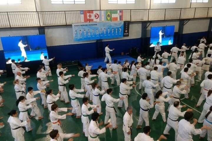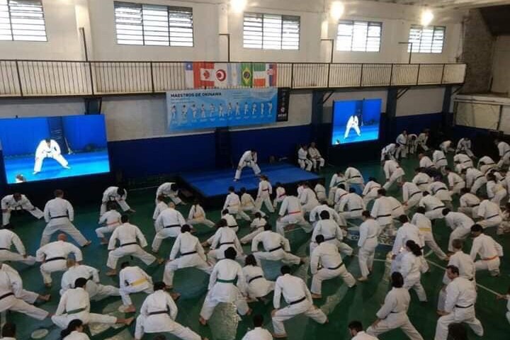 現地参加国は、アルゼンチン、イタリア、セルビア、チリ、ブラジル、日本の6か国。参加者は200名以上となり、大規模なセミナーとなりました。セミナーでは、空手および古武道の基本、型、武器術などを中心に指導と交流を行いました。各国の参加者は非常に熱心で、終始活気のある雰囲気の中で稽古が行われました。稽古だけでなく、各国の指導者や参加者との交流もあり、技術面だけでなく国際的なつながりを深める貴重な機会となりました。