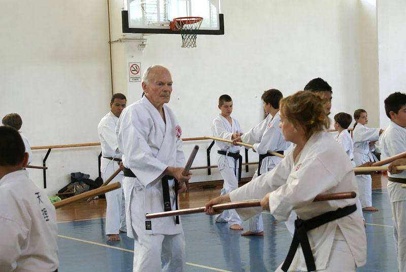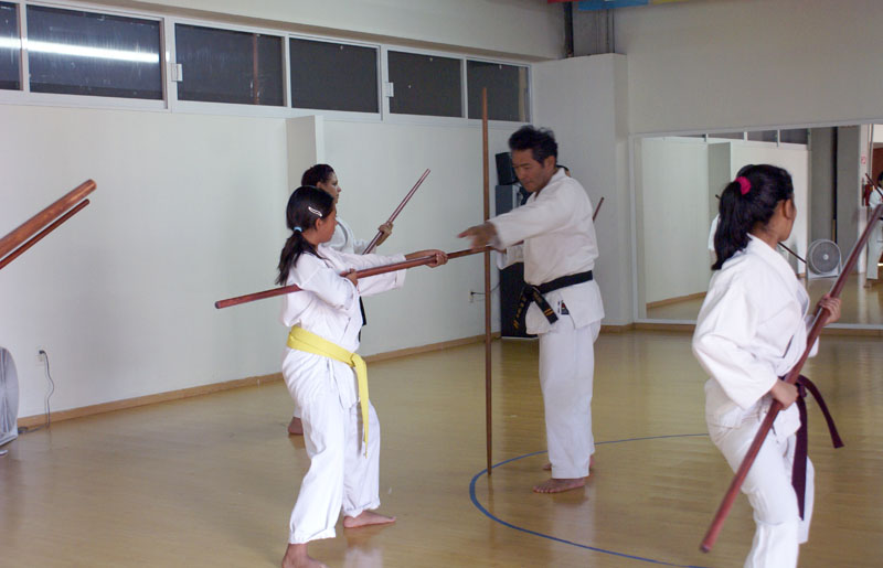 初日は成人の空手有段者を中心に約50名が参加。4日および5日は子どもを含む約100名が参加し、棒、ヌンチャク、サイの基本動作、型、棒対棒などの実技指導を行いました。各日のセミナー終盤には、3名による演武を実施。棒、サイ、トンファー、ティンベー、エークの各種型を披露し、参加者および観客より高い評価を受けました。最終日終了後には、メキシコ側道場代表より、指導に対する謝意として棒およびサイのケースが3名に贈呈されました。あわせて参加者全員による記念撮影を行い、その後、写真撮影や署名の要望にも対応しました。